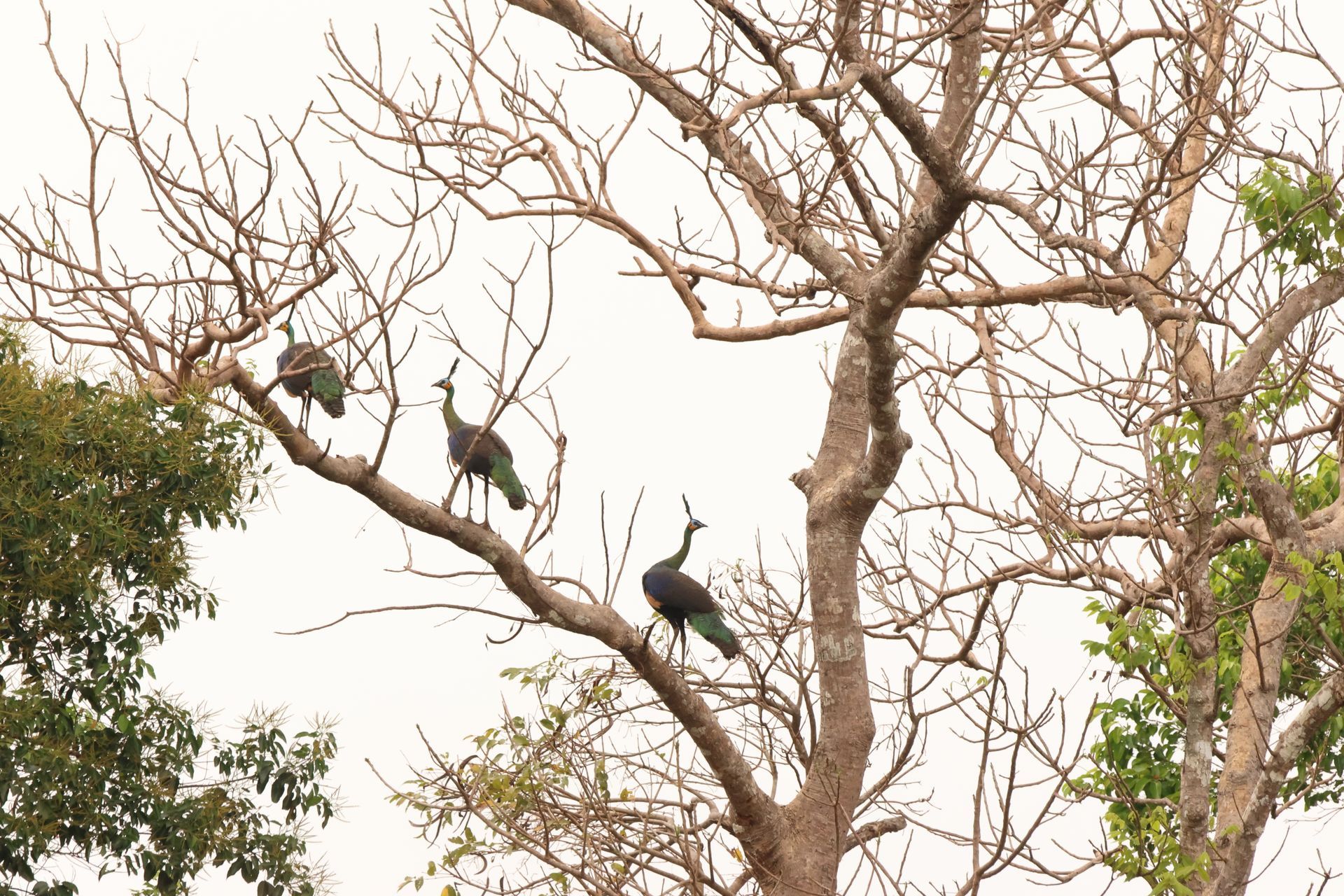 Green Peafowl perched in tall forest trees in Mondulkiri, highlighting the region’s rich birdlife.